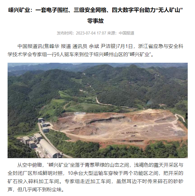 2023年7月4日,中國報道網(wǎng)刊發(fā)《嵊興礦業(yè):一套電子圍欄、三級安全網(wǎng)格、四大數(shù)字平臺助力“無人礦山”零事故》專題報道我市嵊興礦業(yè),全文如下: