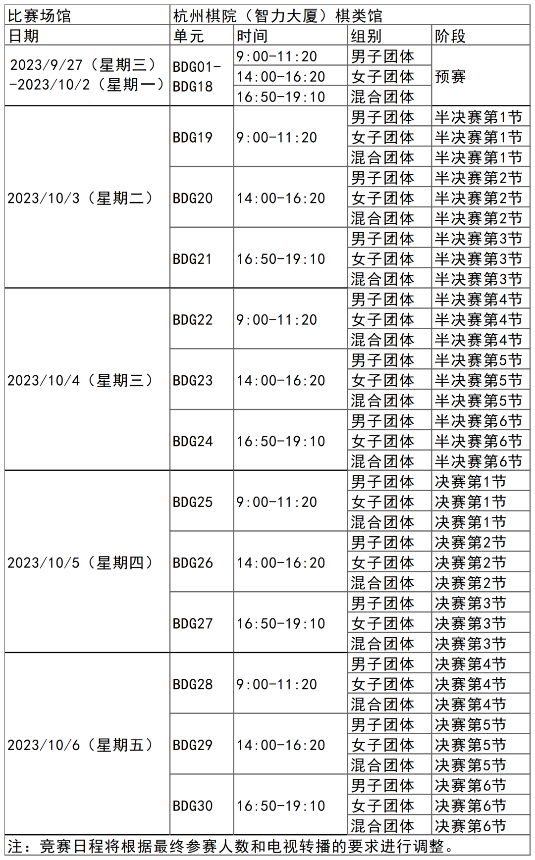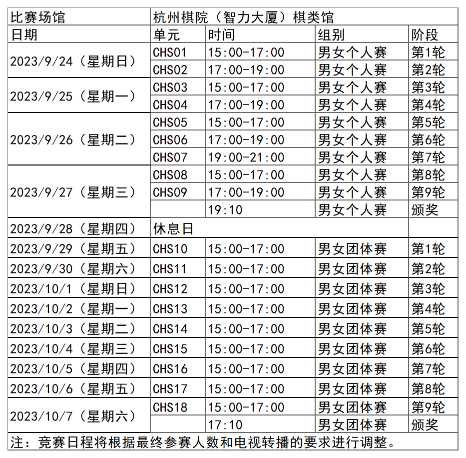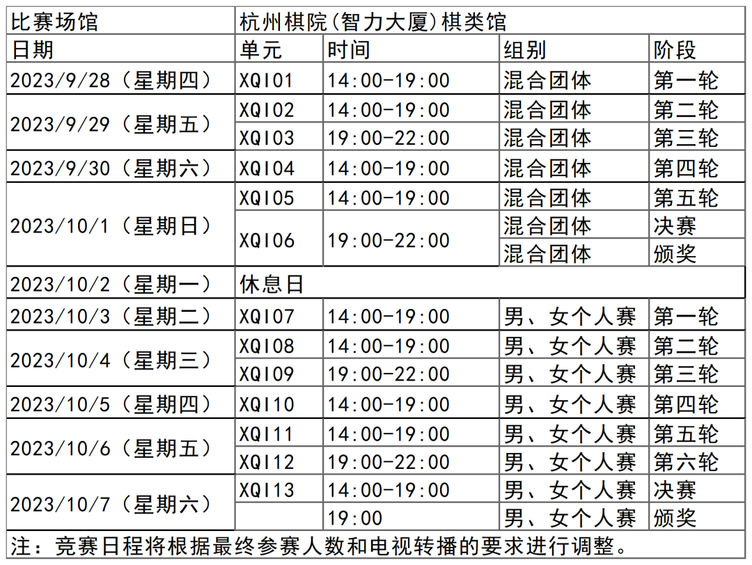 杭州亞運(yùn)會(huì)象棋項(xiàng)目比賽時(shí)間為9月28日-10月7日,在杭州棋院(智力大廈)棋類館舉行,共產(chǎn)生3枚金牌。