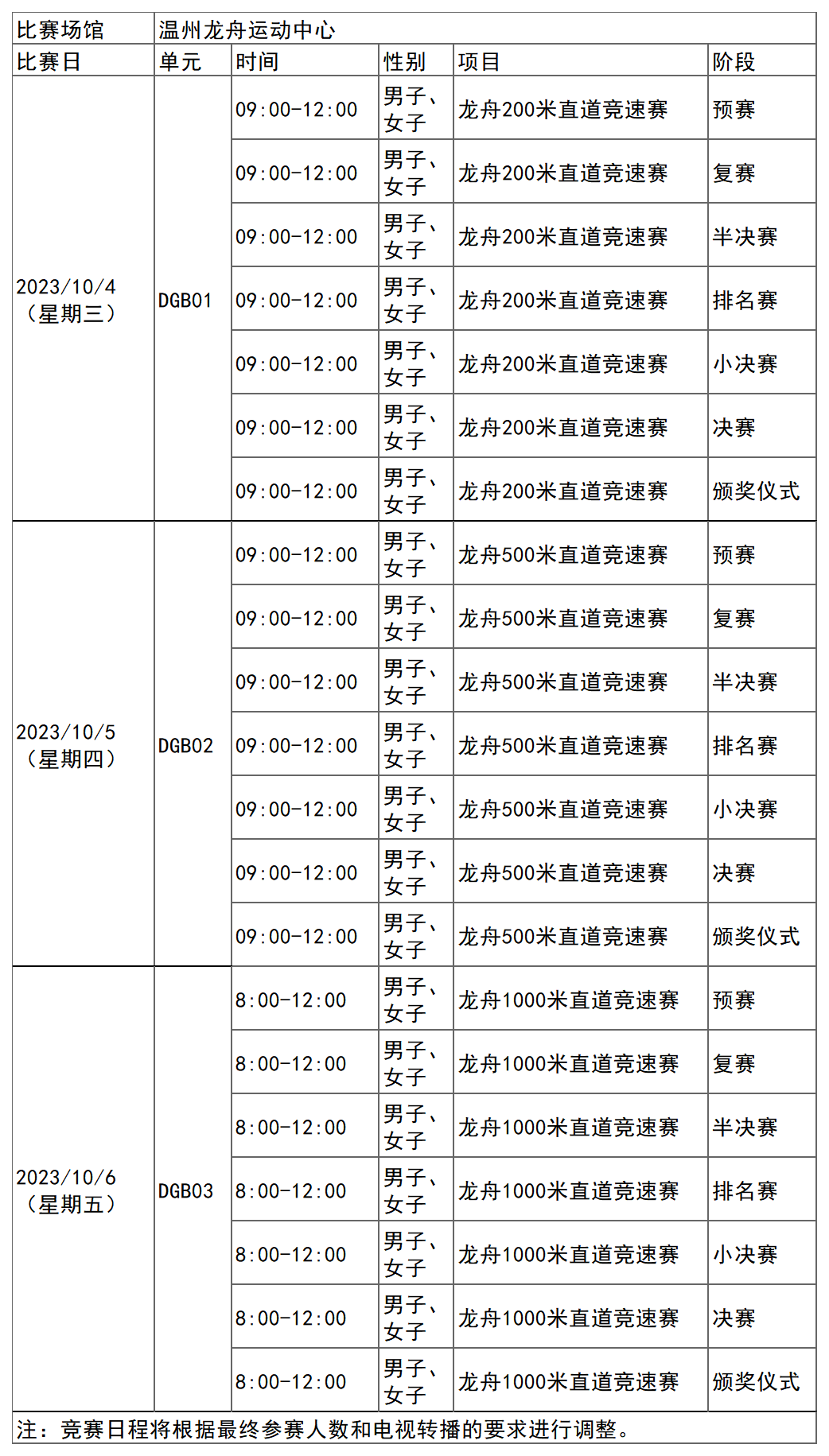 杭州亞運(yùn)會(huì)龍舟項(xiàng)目比賽時(shí)間為10月4日-6日,在浙江溫州龍舟運(yùn)動(dòng)中心舉行,共產(chǎn)生6枚金牌。