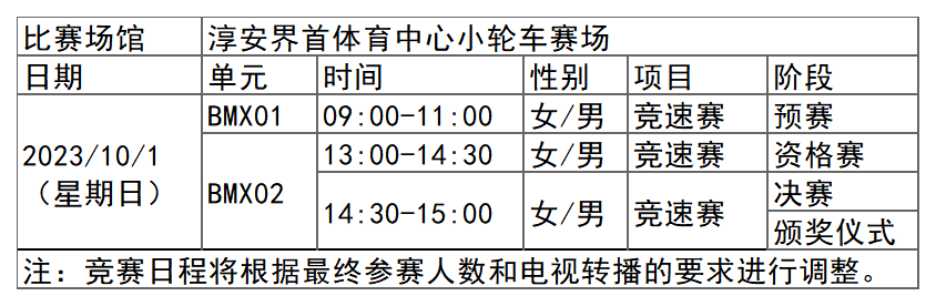 杭州亞運(yùn)會(huì)競(jìng)速小輪車項(xiàng)目比賽時(shí)間為10月1日,在淳安界首體育中心小輪車賽場(chǎng)舉行,共產(chǎn)生2枚金牌。