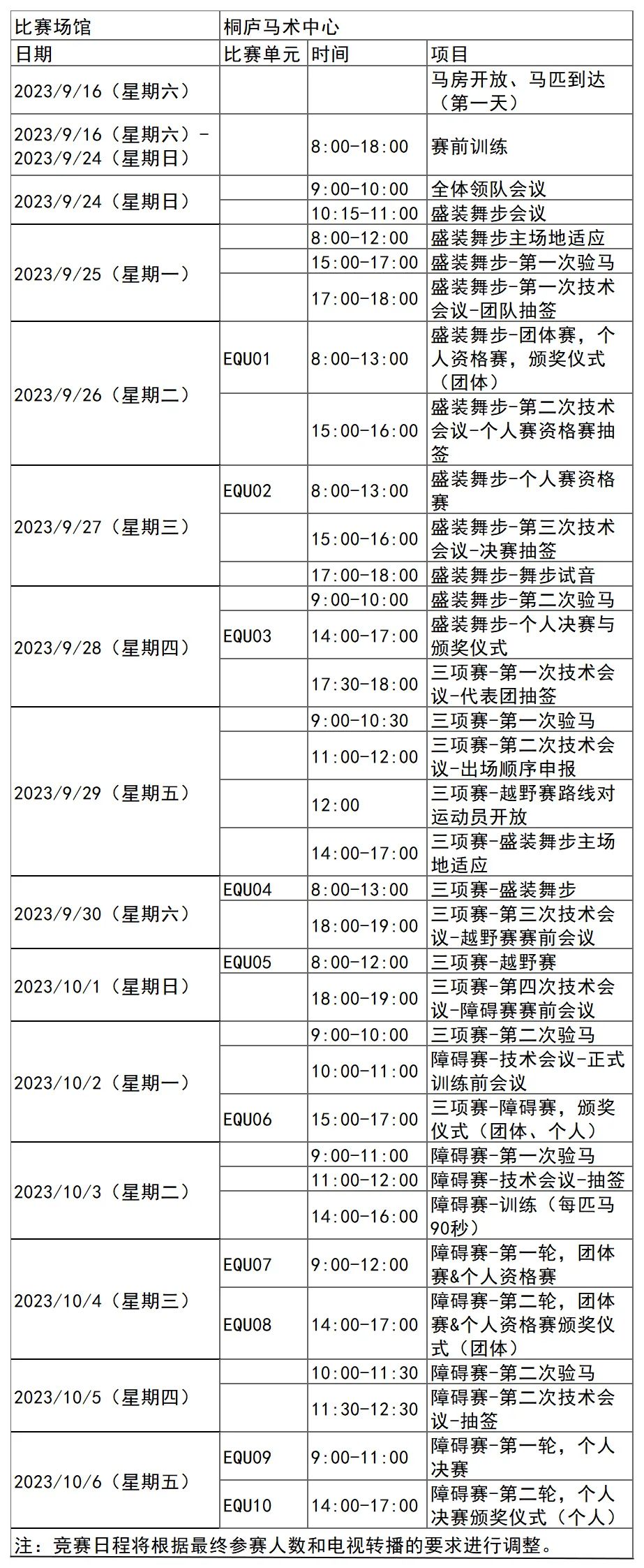 杭州亞運(yùn)會(huì)馬術(shù)項(xiàng)目比賽時(shí)間為9月26日-10月6日,在桐廬馬術(shù)中心舉行,共產(chǎn)生6枚金牌。