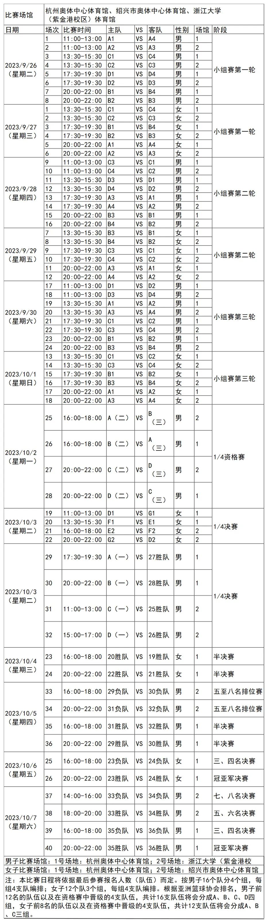 杭州亞運(yùn)會(huì)籃球項(xiàng)目比賽時(shí)間為9月26日-10月7日,在杭州奧體中心體育館、浙江大學(xué)(紫金港校區(qū))體育館、紹興奧體中心體育館舉行,決賽在杭州奧體中心體育館舉行,共產(chǎn)生2枚金牌。