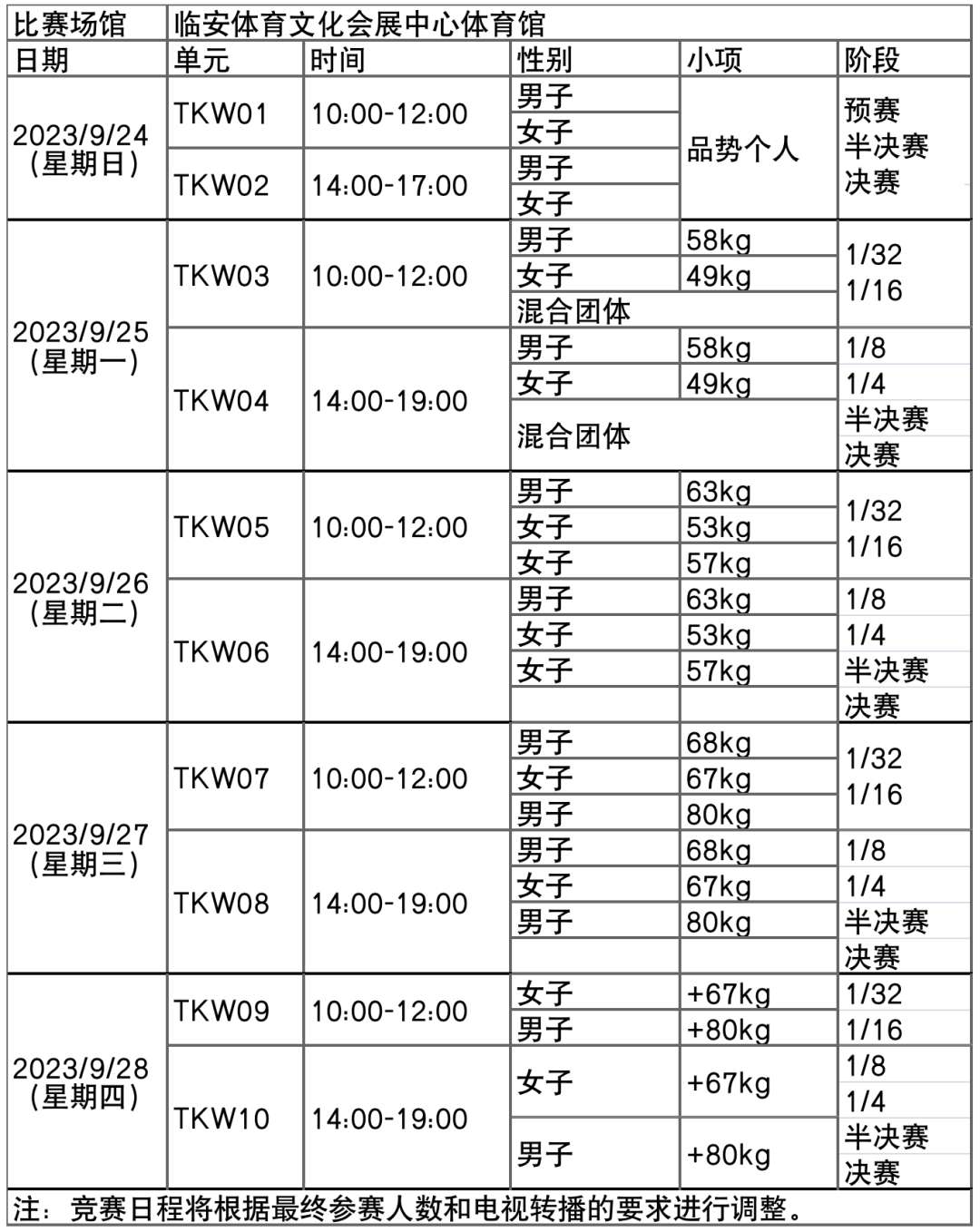 杭州亞運(yùn)會(huì)跆拳道項(xiàng)目比賽時(shí)間為9月24日-28日,在臨安體育文化會(huì)展中心體育館舉行,比賽設(shè)置品勢(shì)和競(jìng)技兩項(xiàng)比賽,共產(chǎn)生13枚金牌。