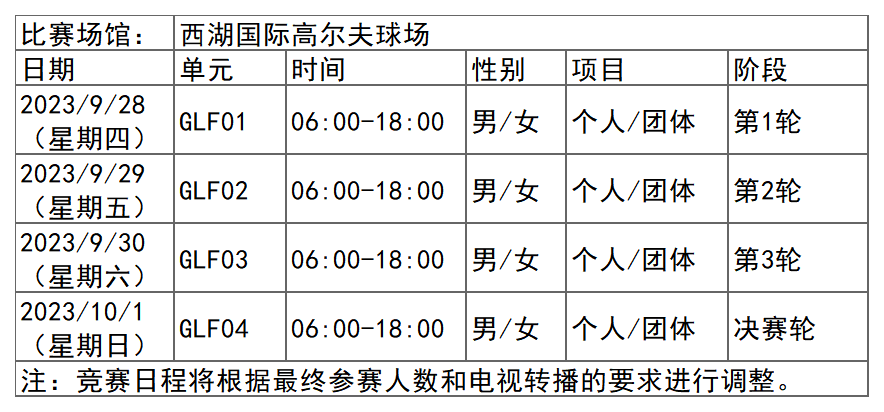 杭州亞運(yùn)會(huì)高爾夫球項(xiàng)目比賽時(shí)間為9月28日-10月1日,在西湖國際高爾夫球場(chǎng)舉行,共產(chǎn)生4枚金牌。