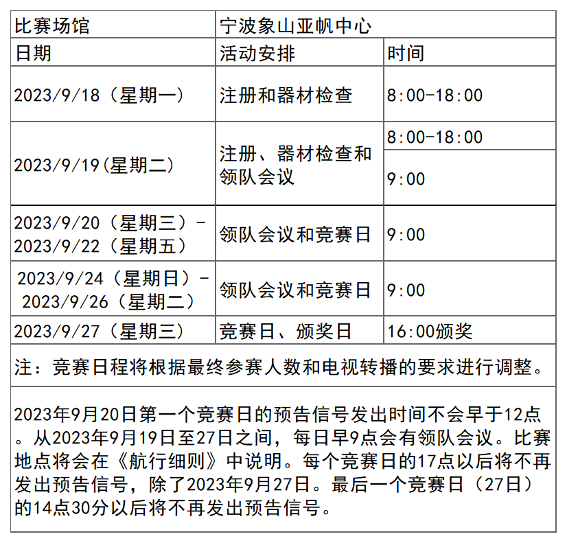 杭州亞運(yùn)會(huì)帆船項(xiàng)目比賽時(shí)間為9月20日-27日,在寧波象山亞帆中心舉行,共產(chǎn)生14枚金牌。