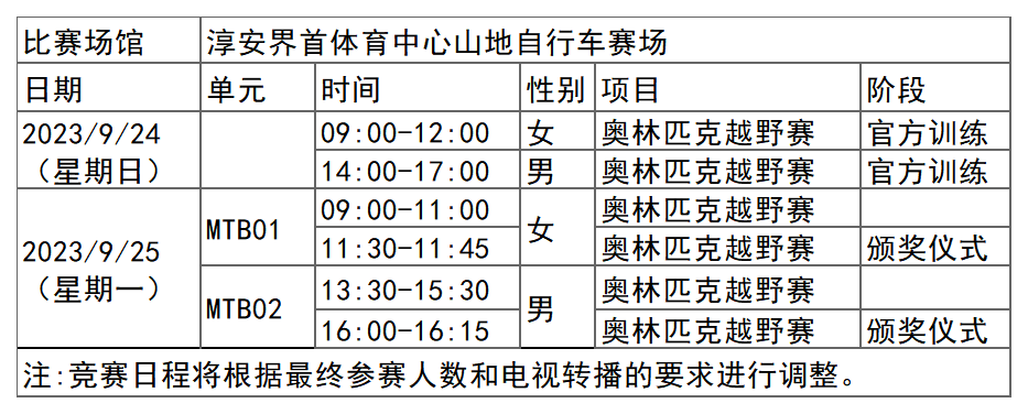 杭州亞運(yùn)會(huì)山地自行車項(xiàng)目比賽時(shí)間為9月25日,在淳安界首體育中心山地自行車賽場(chǎng)舉行,共產(chǎn)生2枚金牌。