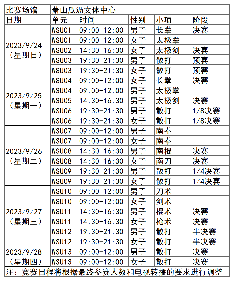 杭州亞運(yùn)會(huì)武術(shù)項(xiàng)目比賽時(shí)間為9月24日-28日,在蕭山瓜瀝文化體育中心舉行,共產(chǎn)生15枚金牌。