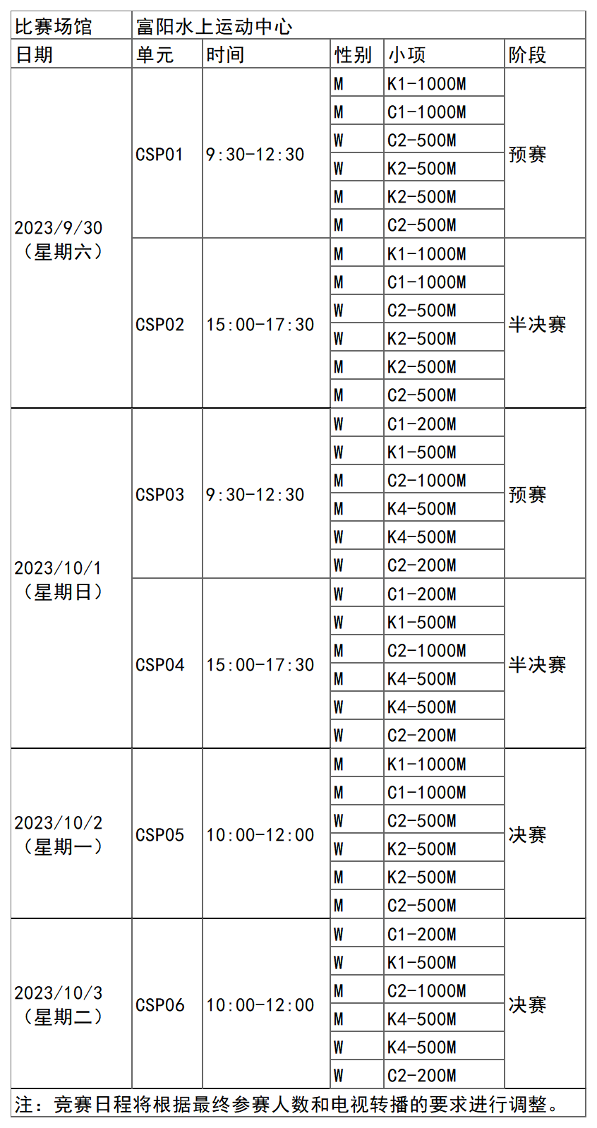 杭州亞運(yùn)會(huì)皮劃艇靜水項(xiàng)目比賽時(shí)間為9月30日-10月3日,在富陽水上運(yùn)動(dòng)中心舉行,共產(chǎn)生12枚金牌。