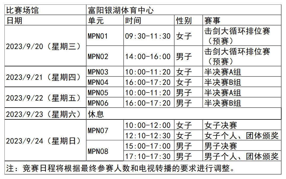 杭州亞運(yùn)會(huì)現(xiàn)代五項(xiàng)項(xiàng)目比賽時(shí)間為9月20日-24日,在富陽銀湖體育中心舉行,共產(chǎn)生4枚金牌。