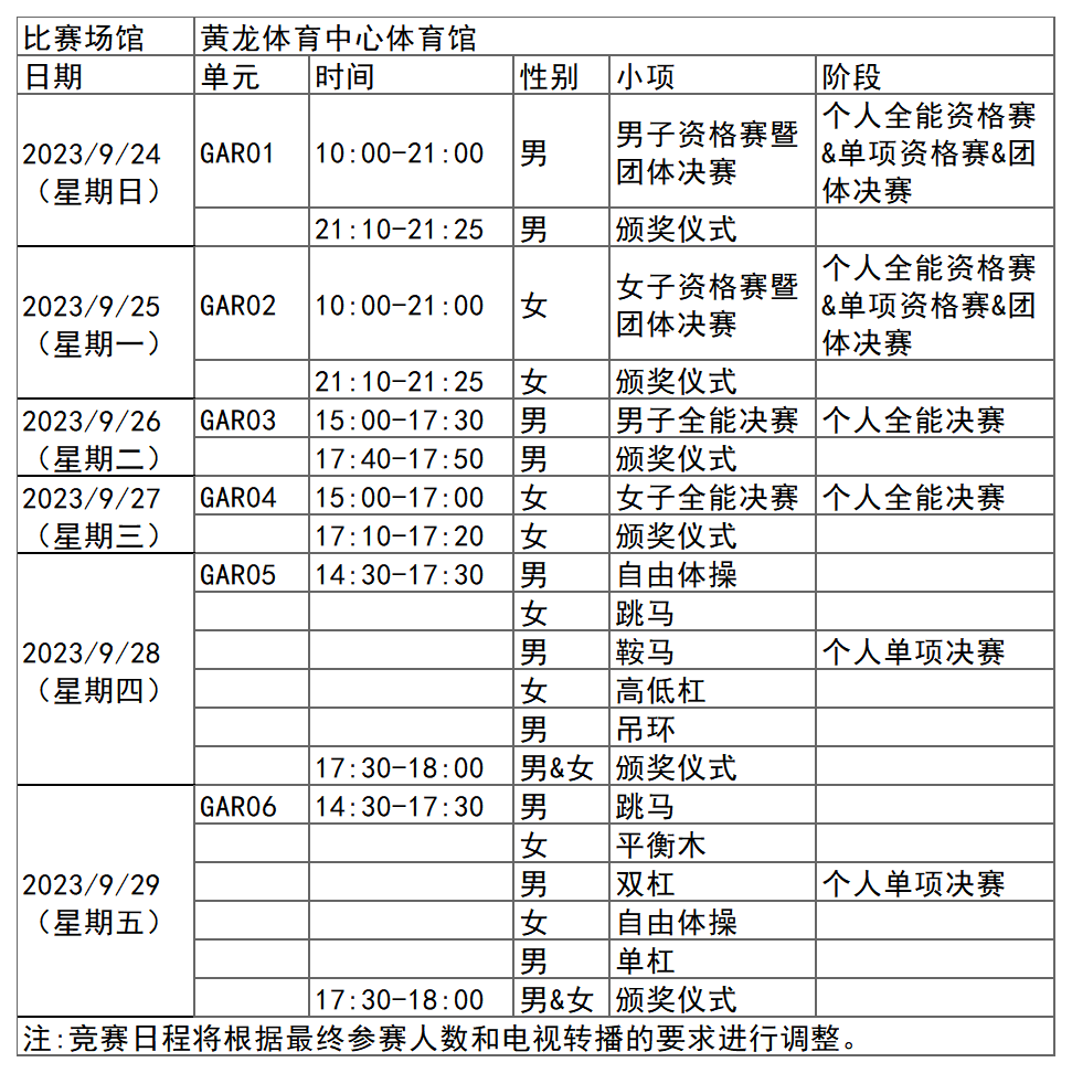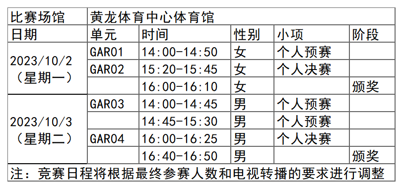杭州亞運(yùn)會(huì)競(jìng)技體操項(xiàng)目比賽時(shí)間為9月24日-29日,在黃龍?bào)w育中心體育館舉行,共產(chǎn)生14枚金牌。