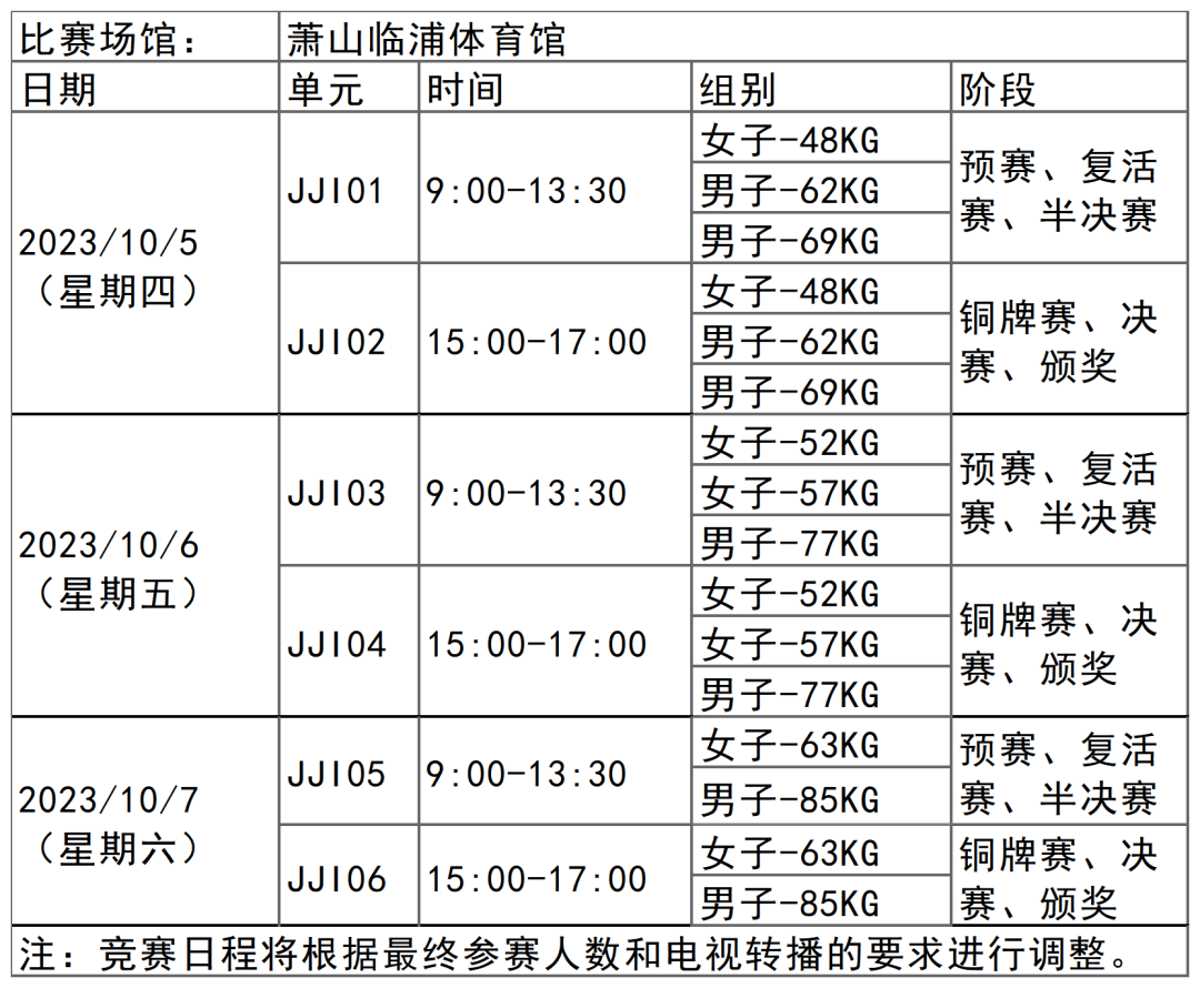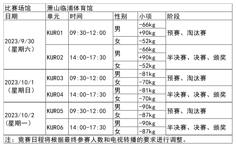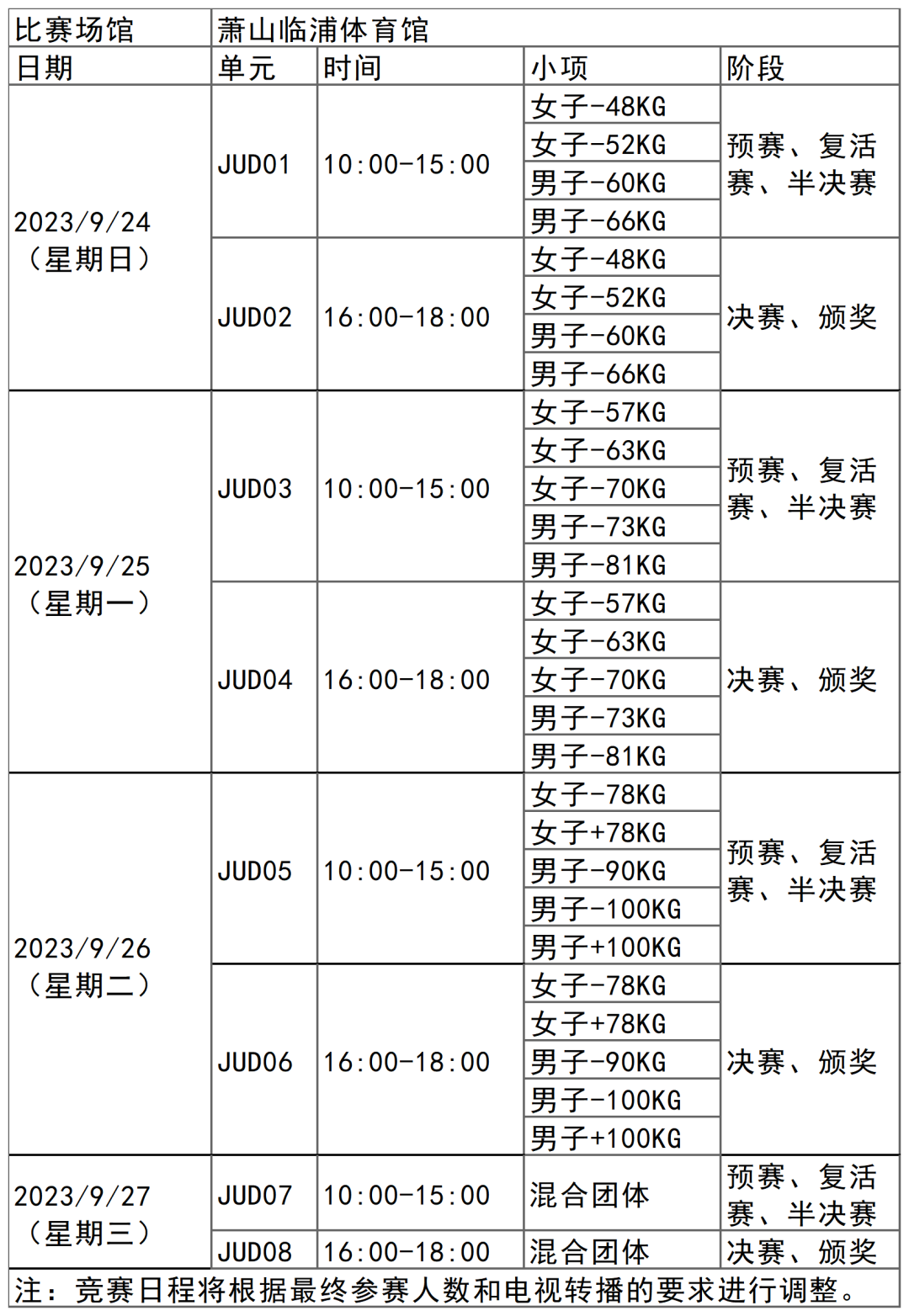 杭州亞運(yùn)會(huì)柔道項(xiàng)目比賽時(shí)間為9月24日-27日,在蕭山臨浦體育館舉行,共產(chǎn)生15枚金牌。