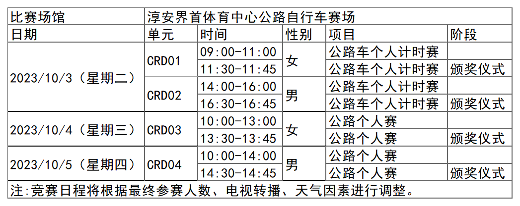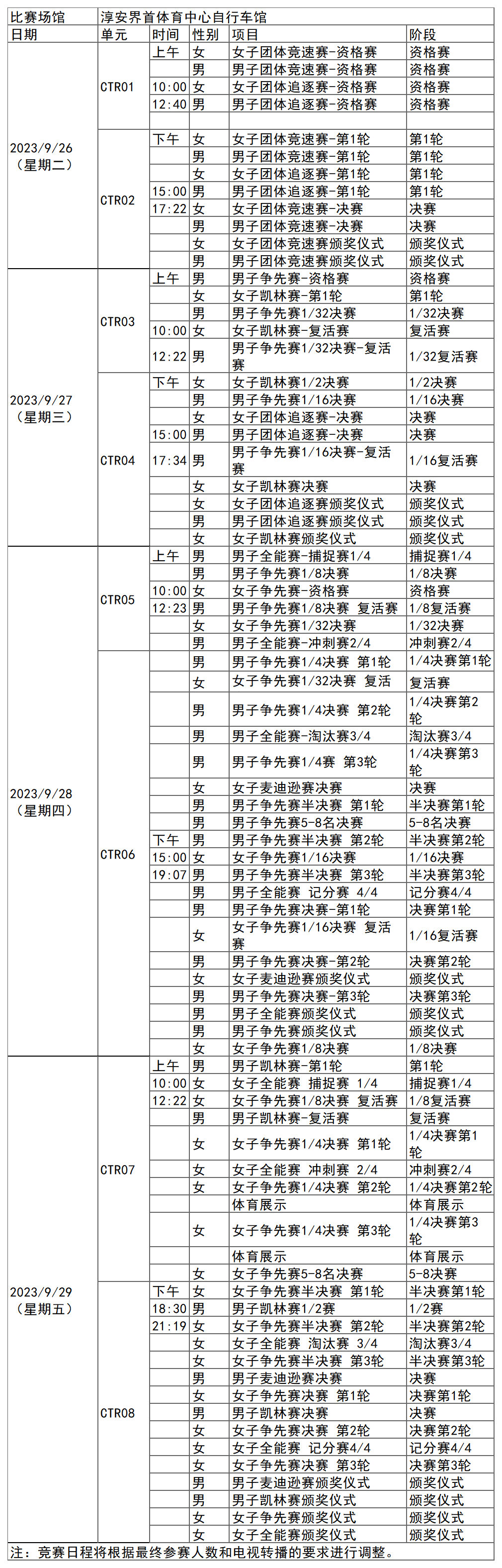 杭州亞運(yùn)會(huì)場(chǎng)地自行車項(xiàng)目比賽時(shí)間為9月26日-29日,在淳安界首體育中心自行車館舉行,共產(chǎn)生12枚金牌。