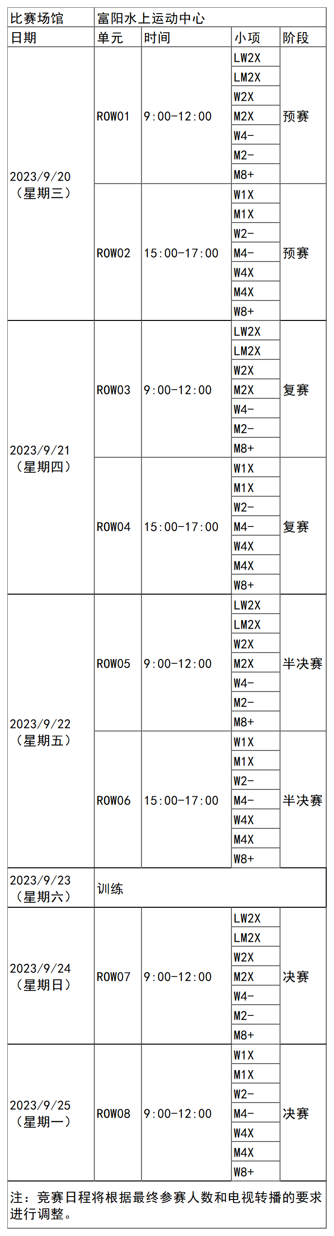 杭州亞運(yùn)會(huì)賽艇項(xiàng)目比賽時(shí)間為9月20日-25日,在富陽水上運(yùn)動(dòng)中心舉行,共產(chǎn)生14枚金牌。