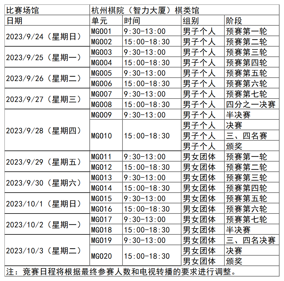 杭州亞運(yùn)會(huì)圍棋項(xiàng)目比賽時(shí)間為9月24日-10月3日,在杭州棋院(智力大廈)棋類館舉行,共產(chǎn)生3枚金牌。
