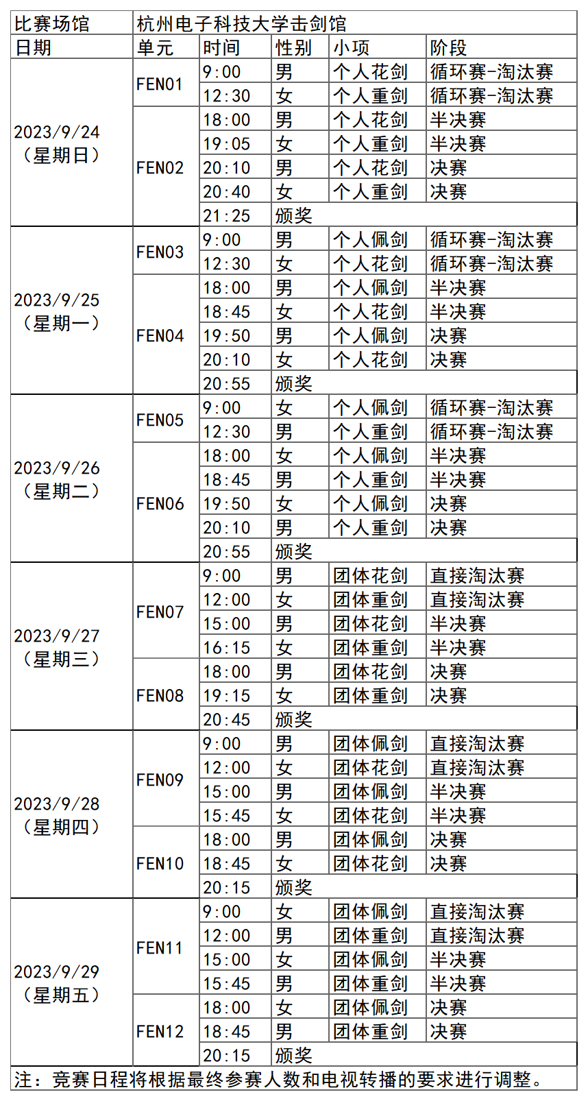 杭州亞運(yùn)會(huì)擊劍比賽場(chǎng)地設(shè)在杭州電子科技大學(xué)體育館,賽期6天,共設(shè)花劍、重劍、佩劍三個(gè)劍種的男子和女子的個(gè)人及團(tuán)體12個(gè)小項(xiàng)比賽,共計(jì)產(chǎn)生12枚金牌。杭州亞運(yùn)會(huì)擊劍比賽執(zhí)行國際擊劍聯(lián)合會(huì)擊劍規(guī)則。