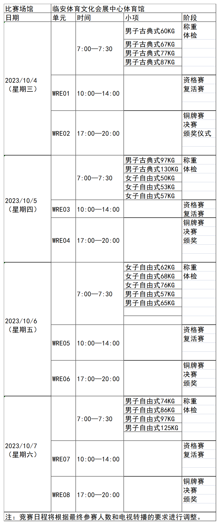 杭州亞運(yùn)會(huì)摔跤項(xiàng)目比賽時(shí)間為10月4日-7日,在臨安體育文化會(huì)展中心體育館舉行,共產(chǎn)生18枚金牌。