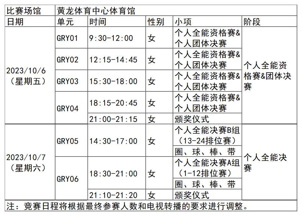 杭州亞運(yùn)會(huì)藝術(shù)體操項(xiàng)目比賽時(shí)間為10月6日-7日,在黃龍?bào)w育中心體育館舉行,共產(chǎn)生2枚金牌。