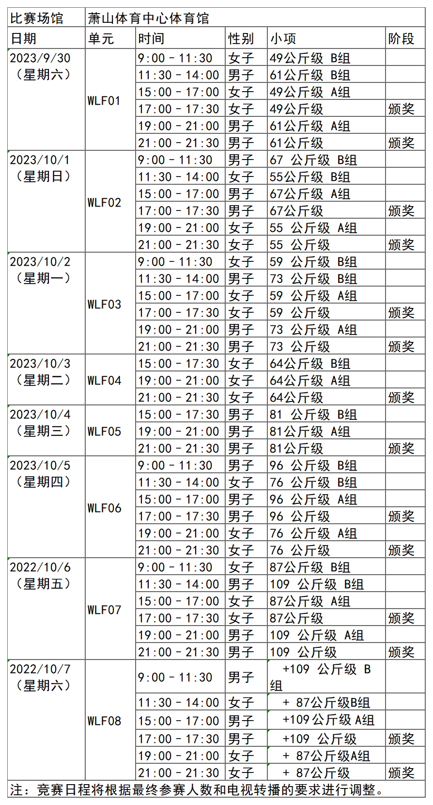杭州亞運(yùn)會(huì)舉重項(xiàng)目比賽時(shí)間為9月30日-10月7日,在蕭山體育中心體育館舉行,共產(chǎn)生14枚金牌。