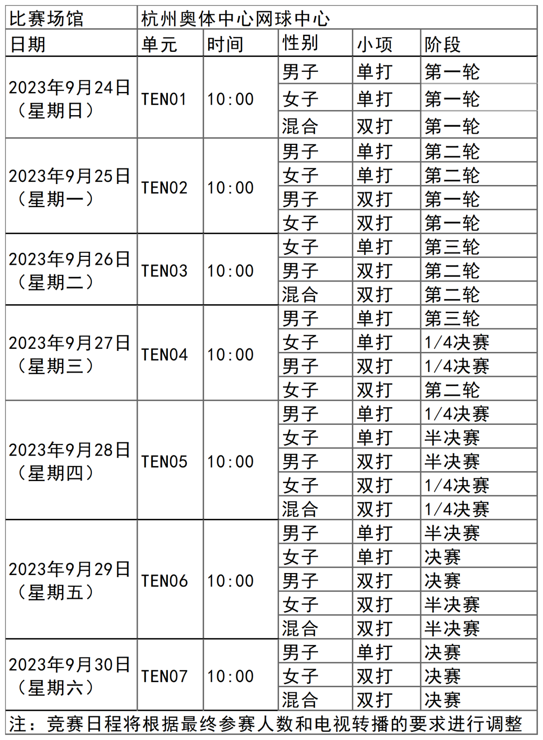 杭州亞運(yùn)會(huì)網(wǎng)球項(xiàng)目比賽時(shí)間為9月24日-30日,在杭州奧體中心網(wǎng)球中心舉行,共產(chǎn)生5枚金牌。