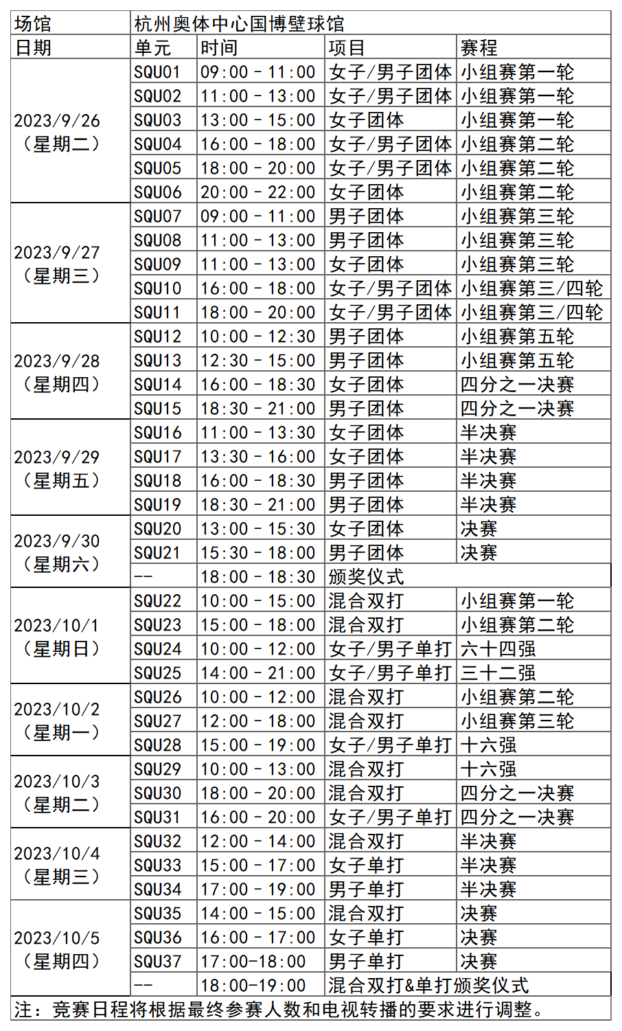 杭州亞運(yùn)會(huì)壁球比賽時(shí)間為9月26日-10月5日,在杭州奧體中心國博壁球館舉行,共產(chǎn)生5枚金牌。