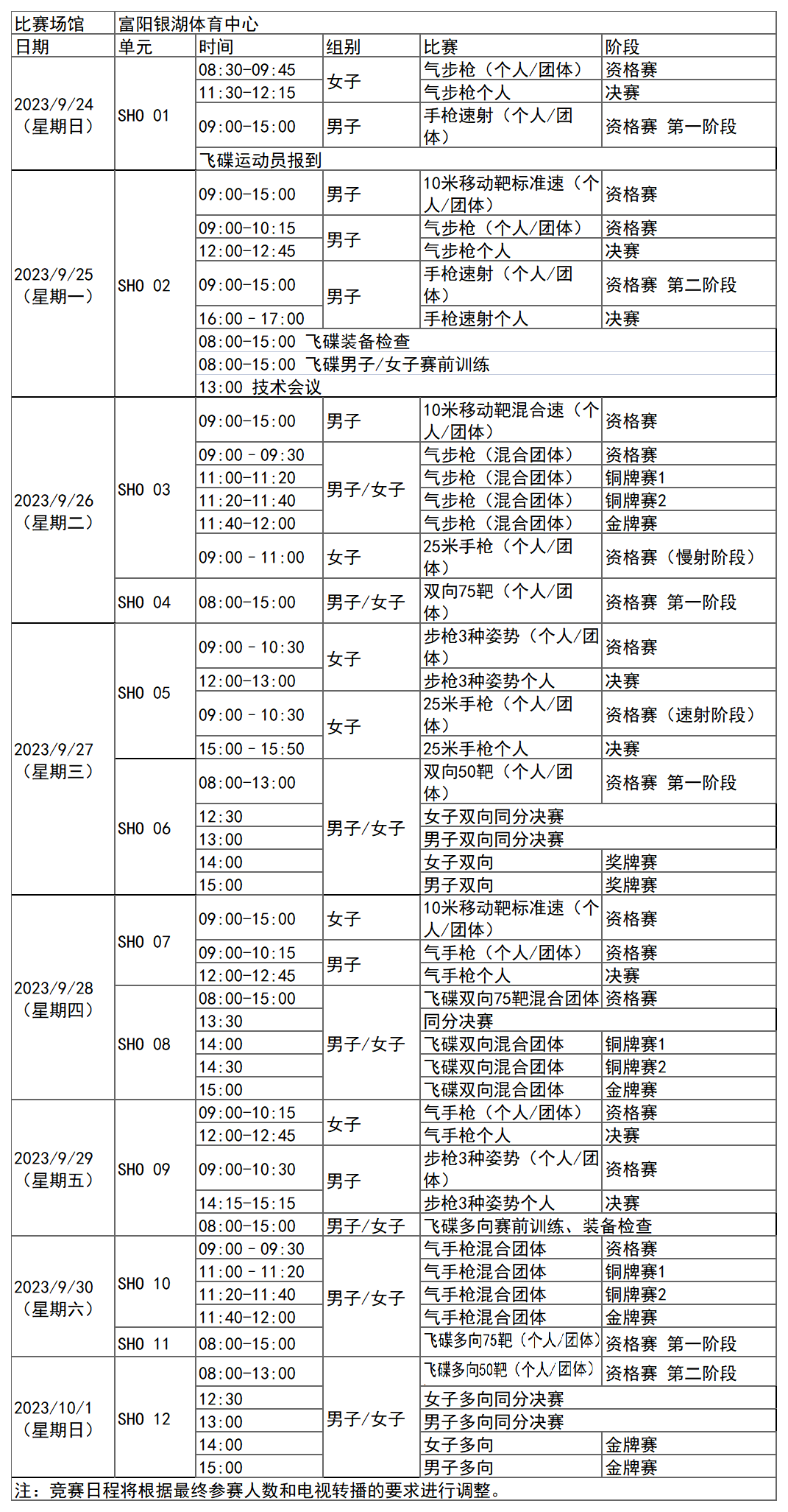 杭州亞運(yùn)會(huì)步槍、手槍、飛碟項(xiàng)目比賽時(shí)間為9月24日-10月1日,在富陽銀湖體育中心舉行,共產(chǎn)生33枚金牌。