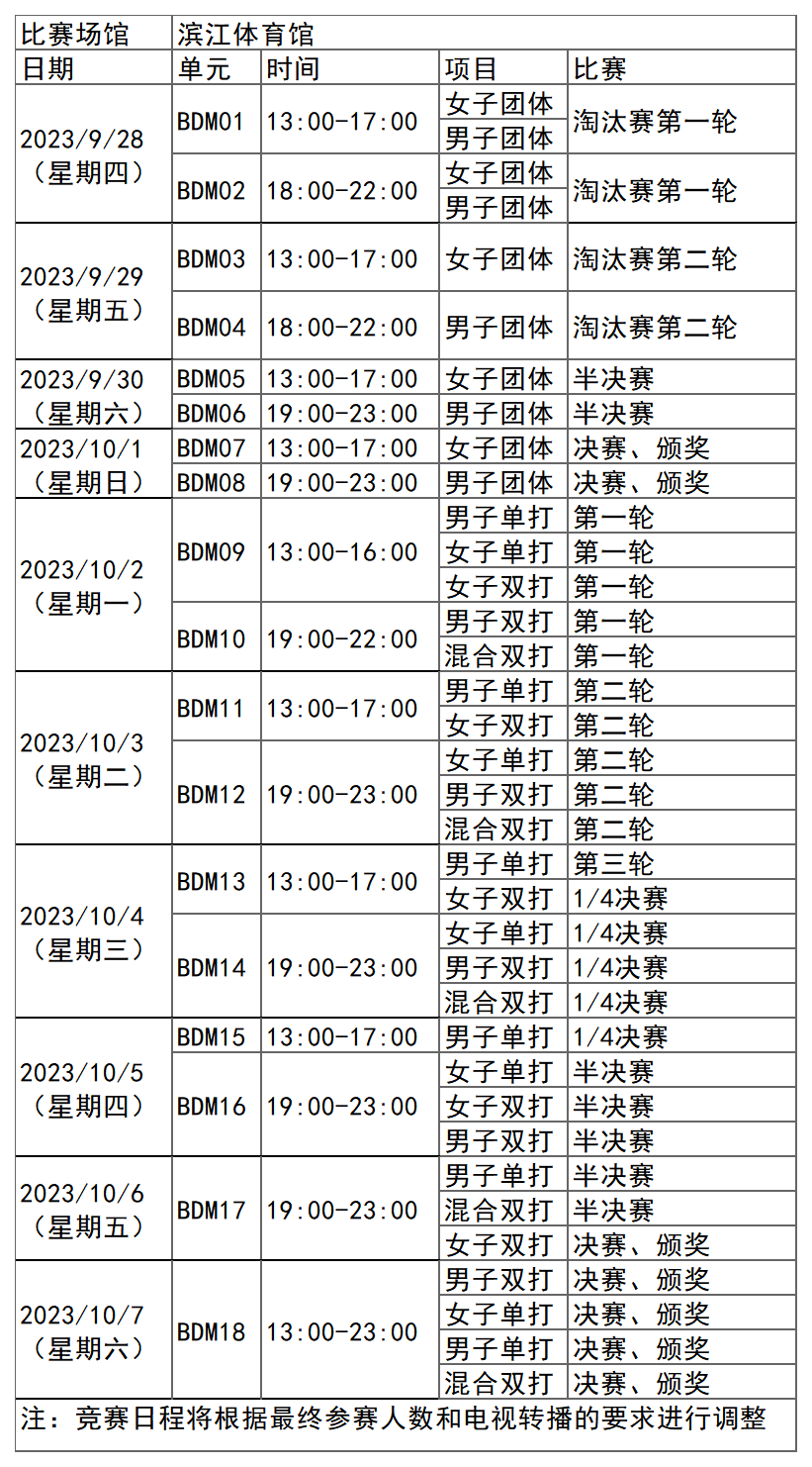 杭州亞運(yùn)會(huì)羽毛球項(xiàng)目比賽時(shí)間為9月28日-10月7日,在濱江體育館舉行,共產(chǎn)生7枚金牌。