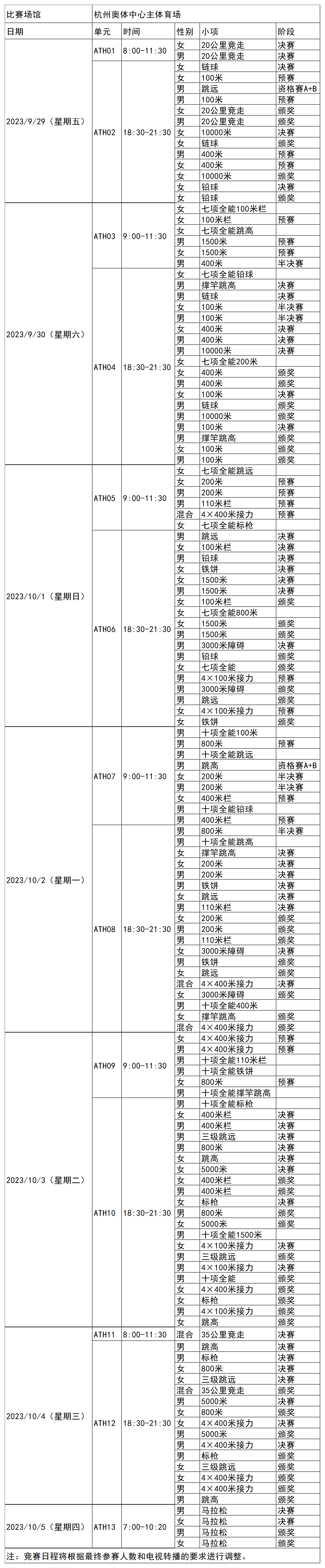 杭州亞運(yùn)會(huì)田徑項(xiàng)目比賽時(shí)間為9月29日-10月5日,在杭州奧體中心體育場(chǎng)舉行,共產(chǎn)生48枚金牌。