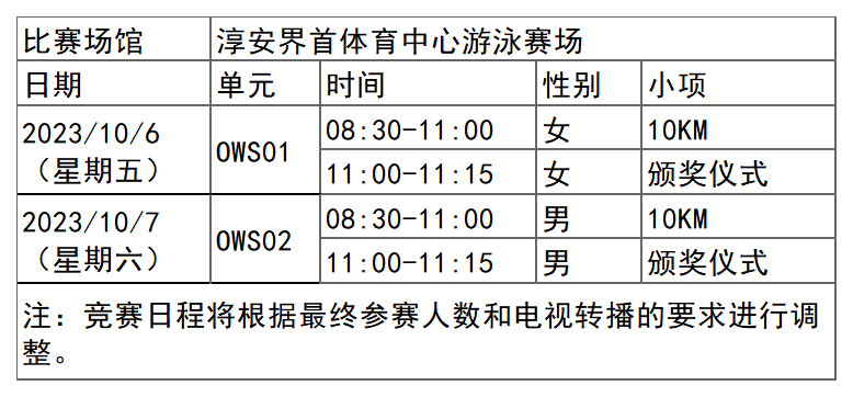 杭州亞運(yùn)會(huì)馬拉松游泳項(xiàng)目比賽時(shí)間為10月6日-7日,在淳安界首體育中心游泳賽場(chǎng)舉行,共產(chǎn)生2枚金牌。