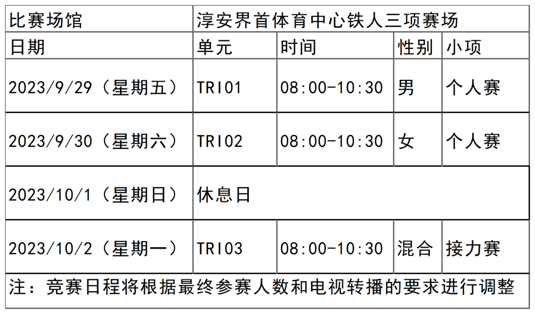 杭州亞運(yùn)會(huì)鐵人三項(xiàng)項(xiàng)目比賽時(shí)間為9月29日-10月2日,在淳安界首體育中心鐵人三項(xiàng)賽場(chǎng)舉行,共產(chǎn)生3枚金牌。