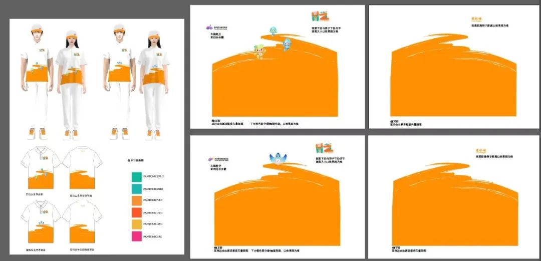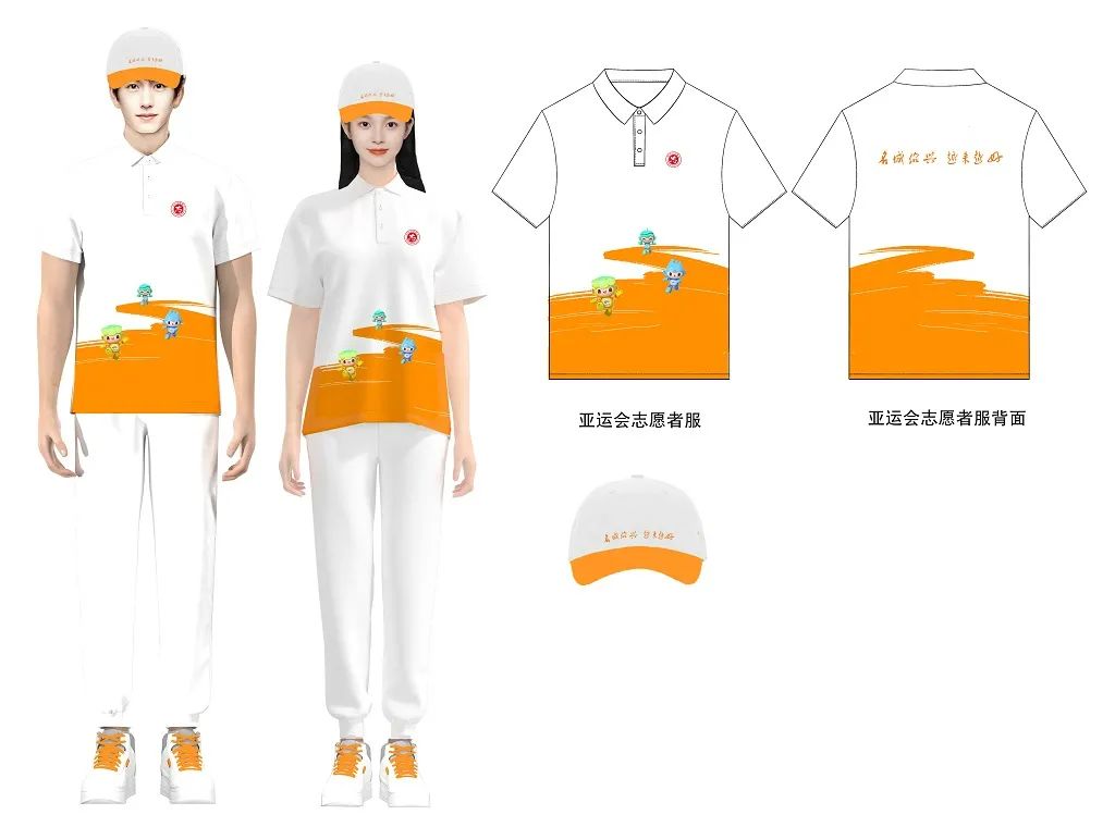 從定稿的設(shè)計開發(fā)稿來看,紹興亞運城市志愿服裝色彩明快,是一款以白色、橙色為主色調(diào)的短袖T恤,每件服裝正面都印有紹興志愿服務(wù)的標(biāo)識,還有杭州亞運吉祥物“琮琮”“蓮蓮”“宸宸”的圖案,左袖部分還帶有亞運會會徽,這款洋溢著青春活力和向上精神的志愿服裝,背部寫著“名城紹興,越來越好”標(biāo)語,是紹興精神風(fēng)貌的縮影。