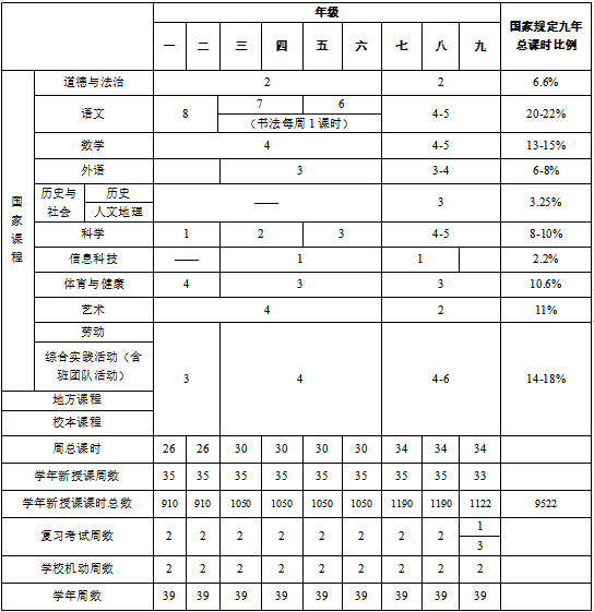 周課時(shí)數(shù)按標(biāo)準(zhǔn)課時(shí),即小學(xué)每課時(shí)按40分鐘計(jì)算,初中每課時(shí)按45分鐘計(jì)算。在保證周總時(shí)長(zhǎng)不變的情況下,學(xué)校可自主確定各科目周課時(shí)數(shù),自主確定每節(jié)課的具體時(shí)長(zhǎng),學(xué)校機(jī)動(dòng)時(shí)間可用于集中安排勞動(dòng)周、科技文體活動(dòng)等。