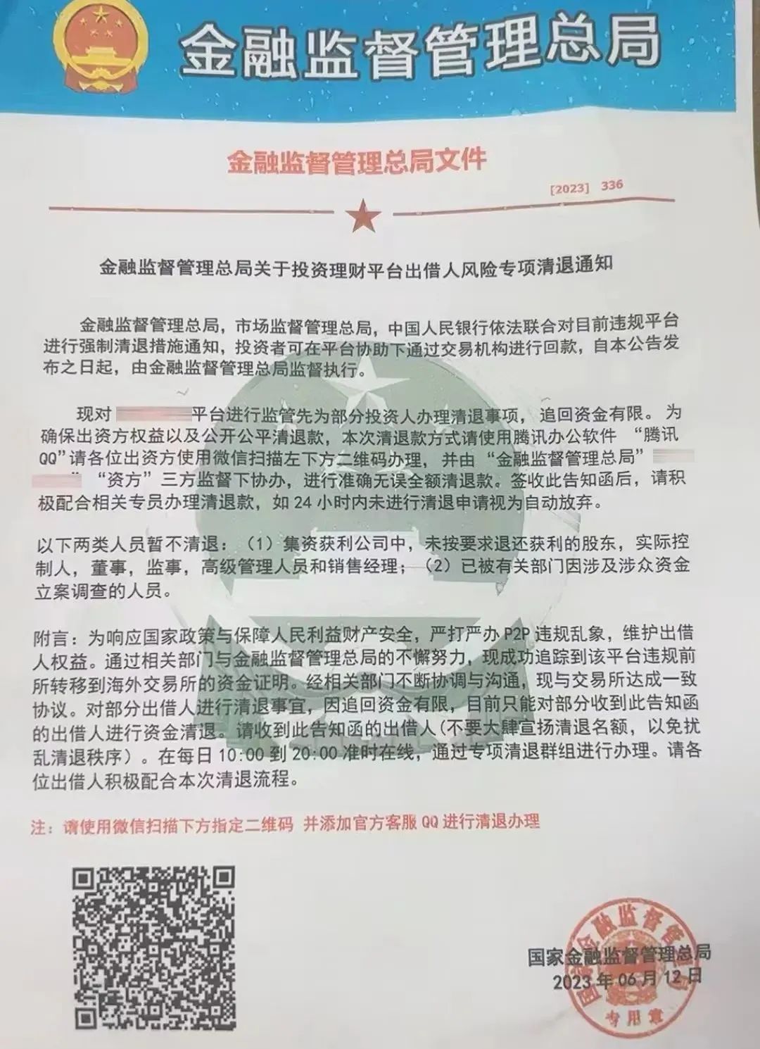 近日,江蘇張家港的李女士收到了“國(guó)家金融監(jiān)督管理總局”寄來(lái)的一份“紅頭文件”,稱將為某平臺(tái)的部分投資人辦理清退事宜。