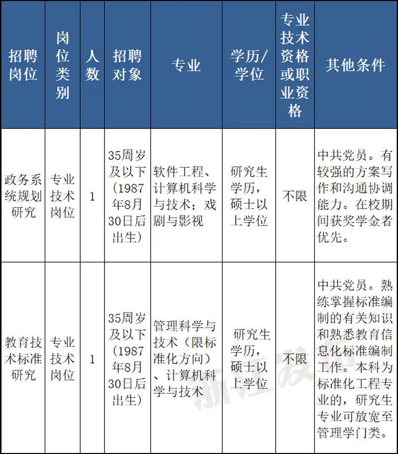 本次招聘需求為政務(wù)系統(tǒng)規(guī)劃研究、教育技術(shù)標(biāo)準(zhǔn)研究2個崗位共2人。