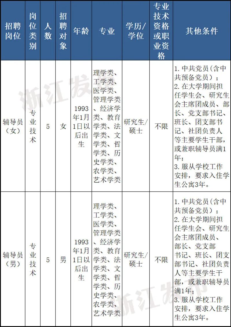 本批次招聘需求為2個崗位共10人,其中輔導(dǎo)員(女)崗5人,輔導(dǎo)員(男)崗5人。