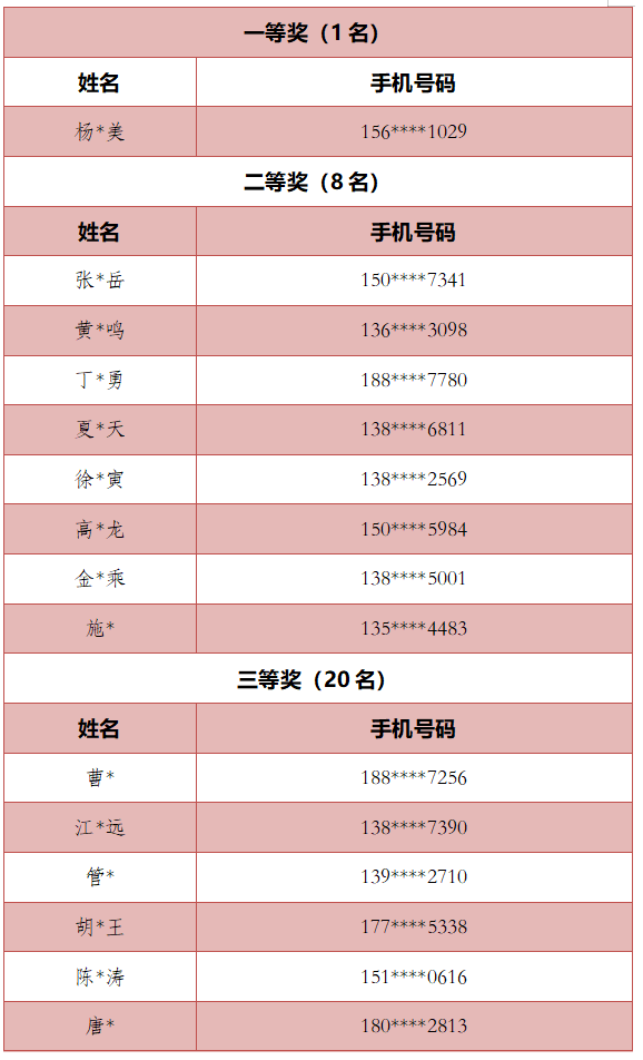 當(dāng)然,猜中是本事,但被選中是本事加運(yùn)氣哦,你會(huì)上榜嗎?組委會(huì)采取抽簽的形式,從猜中棋王的人員中抽取一等獎(jiǎng)1名,二等獎(jiǎng)8名,三等獎(jiǎng)20名?,F(xiàn)公布獲獎(jiǎng)名單: