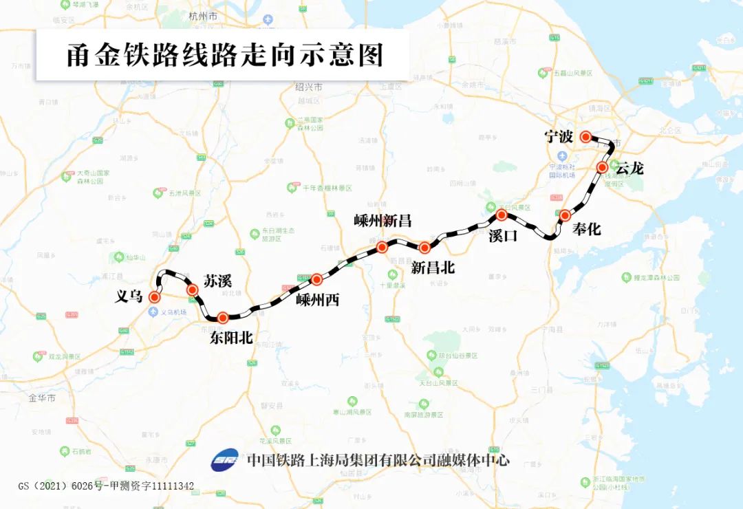 甬金鐵路東起甬臺溫鐵路云龍站,途經(jīng)寧波市、紹興市,向西終至滬昆鐵路金華市義烏站,新建正線全長約188.3公里,全線設(shè)云龍、奉化、溪口、新昌北、嵊州新昌、嵊州西、東陽北、蘇溪、義烏9個(gè)車站,設(shè)計(jì)時(shí)速160公里,預(yù)留200公里時(shí)速條件,為雙線客貨共線的I級電氣化鐵路。甬金鐵路雙層高箱集裝箱運(yùn)輸試驗(yàn)段起自嵊州新昌站,經(jīng)嵊州西站至東陽北站,全長60.82公里。