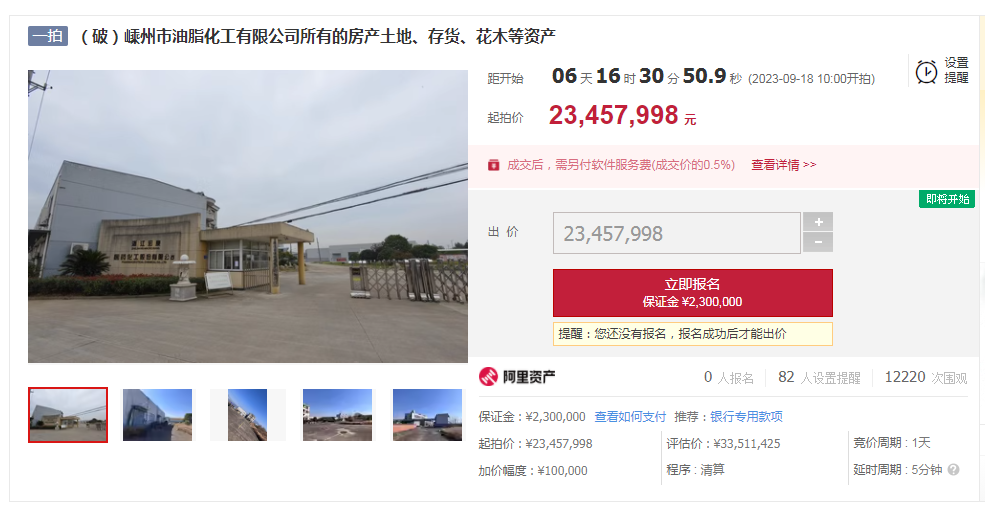 嵊州市油脂化工有限公司管理人將于2023年9月18日10時(shí)至2023年9月19日10時(shí)止(延時(shí)除外)在淘寶網(wǎng)阿里拍賣破產(chǎn)強(qiáng)清平臺(tái)對(duì)嵊州市油脂化工有限公司名下的坐落在嵊州市黃澤鎮(zhèn)大橋路88號(hào)的工業(yè)房地產(chǎn)及相關(guān)資產(chǎn)進(jìn)行第一次公開拍賣活動(dòng)(處置單位:嵊州市油脂化工有限公司管理人,監(jiān)督單位:嵊州市人民法院),現(xiàn)公告如下:
