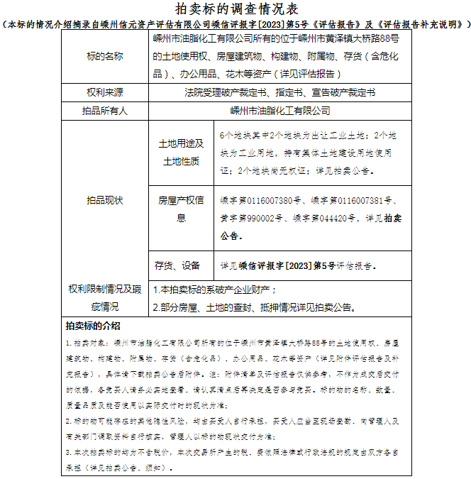 嵊州市油脂化工有限公司名下的坐落在嵊州市黃澤鎮(zhèn)大橋路88號(hào)的工業(yè)房地產(chǎn)及相關(guān)資產(chǎn)。產(chǎn)權(quán)人為嵊州市油脂化工有限公司,部分工業(yè)房地產(chǎn)已取得《國有土地使用權(quán)證》或《集體土地使用權(quán)證》《房屋所有權(quán)證》,部分工業(yè)房地產(chǎn)未取得,具體情況如下: