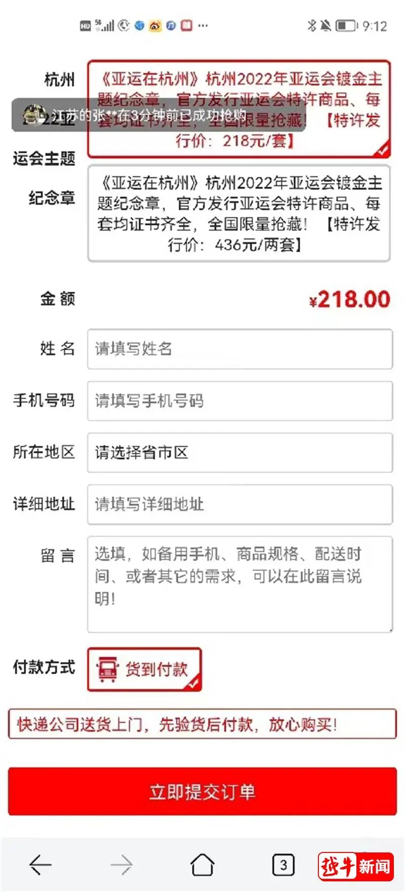 那么究竟是與不是呢?記者進(jìn)行了核實。記者點(diǎn)擊了上述鏈接,頁面跳轉(zhuǎn)到了一個所謂“杭州2022年亞運(yùn)會鍍金主題紀(jì)念章”的搶購頁面,再往下滑則是具體訂單購買頁,上面寫著紀(jì)念章特許發(fā)行價218元/套。