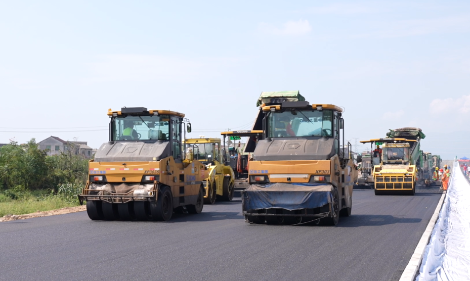 在527國(guó)道嵊州甘霖至長(zhǎng)樂段1標(biāo)的施工現(xiàn)場(chǎng),只見壓路機(jī)、推鋪機(jī)、運(yùn)輸車等各類機(jī)械設(shè)施,正來(lái)回穿梭于工地上,現(xiàn)場(chǎng)一派熱火朝天的景象。