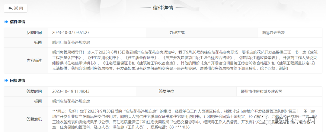 您好!您于2023年9月30日反映“啟**苑違規(guī)交房”的事項(xiàng),經(jīng)我單位工作人員調(diào)查核實(shí),根據(jù)《城市房地產(chǎn)開發(fā)經(jīng)營(yíng)管理?xiàng)l例》第三十一條(房地產(chǎn)開發(fā)企業(yè)應(yīng)當(dāng)在商品房交付使用時(shí),向購(gòu)買人提供住宅質(zhì)量保證書和住宅使用說(shuō)明書。)和購(gòu)房合同第十條規(guī)定,經(jīng)了解核實(shí),啟**苑開發(fā)商已對(duì)項(xiàng)目竣工驗(yàn)收備案表和測(cè)繪成果予以公示,而住宅質(zhì)量保證書和住宅使用說(shuō)明書也已交至您手中。