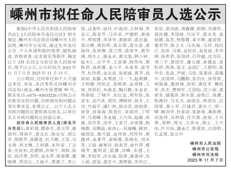 根據(jù)《中華人民共和國人民陪審員法》、《人民陪審員選任辦法》相關(guān)規(guī)定,嵊州市司法局會(huì)同嵊州市人民法院、嵊州市公安局,通過發(fā)布選任公告、個(gè)人申請(qǐng)和組織推薦、隨機(jī)抽選、資格審查、征求意見等程序,確定以下235名同志為擬任命人民陪審員,現(xiàn)予以公示,公示時(shí)間為2023年11月7日至2023年11月13日。