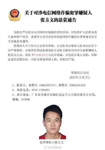 近日,廣東英德市公安局對(duì)電信網(wǎng)絡(luò)詐騙團(tuán)伙重要成員張永勝、丘小雄、徐培星、張方文、巫昌發(fā)、鄧寶運(yùn)、鄧海堅(jiān)實(shí)施懸賞通緝。發(fā)現(xiàn)上述人員立即向公安機(jī)關(guān)舉報(bào),對(duì)提供有效線索或協(xié)助公安機(jī)關(guān)抓獲該名涉詐犯罪嫌疑人的有功人員,將給予5萬(wàn)至30萬(wàn)人民幣獎(jiǎng)勵(lì)。