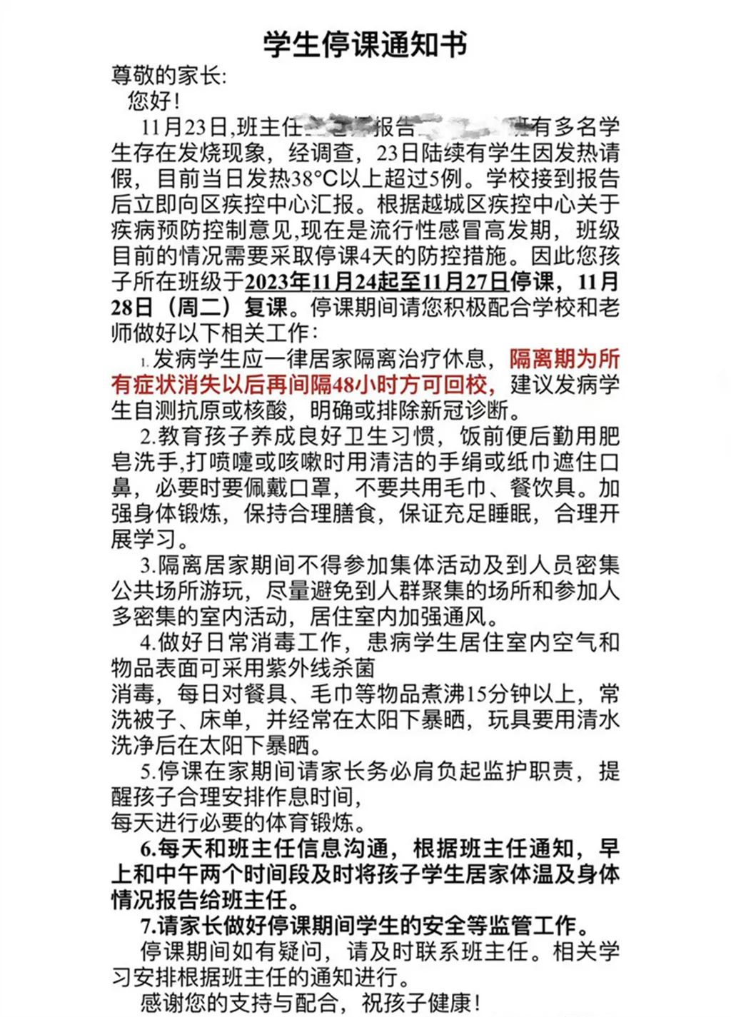 據(jù)停課通知顯示,11月23日,該班班主任報(bào)告班中多名學(xué)生存在發(fā)熱現(xiàn)象,經(jīng)調(diào)查,23日陸續(xù)有學(xué)生因發(fā)熱請假,當(dāng)日發(fā)熱38℃以上超過5例。學(xué)校接到報(bào)告后立即向區(qū)疾控中心匯報(bào)。根據(jù)越城區(qū)疾控中心關(guān)于疾病預(yù)防控制意見,現(xiàn)在是流行性感冒高發(fā)期,班級目前的情況需要采取停課4天的防控措施。因此,該班級于2023年11月24日起至11月27日停課,11月28日(周二)復(fù)課。
