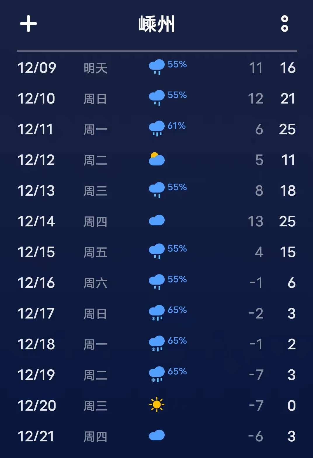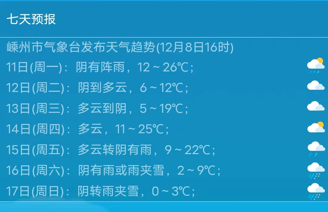 記者查看了相關天氣預報APP,12月16日至21日,嵊州的最低氣溫都在零下,特別是19和20日最低溫度-7℃,其中幾天還有雨夾雪。