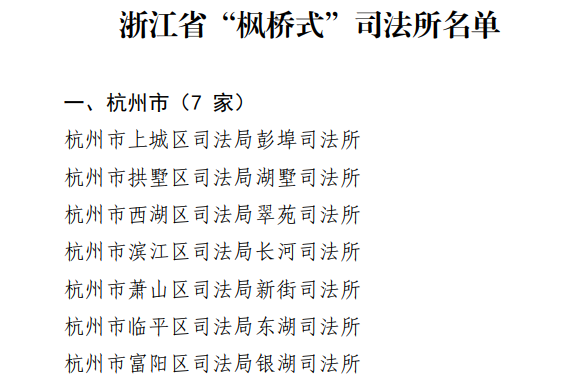 日前,浙江省司法廳發(fā)出《關(guān)于命名“楓橋式”司法所的決定》,根據(jù)《“楓橋式”司法所建設(shè)實(shí)施方案》和《關(guān)于做好 2023 年“楓橋式”司法所申報(bào)命名工作的通知》要求,在前期培育和建設(shè)基礎(chǔ)上,經(jīng)縣市兩級(jí)司法行政機(jī)關(guān)審核推薦、省廳綜合評(píng)定等程序,報(bào)經(jīng)廳黨委同意,現(xiàn)命名杭州市上城區(qū)司法局彭埠司法所等 46 家司法所為我省第四批“楓橋式”司法所。