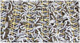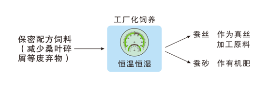 工廠化養(yǎng)蠶是以現(xiàn)代農(nóng)業(yè)科技理念,嵊州市通過(guò)推動(dòng)養(yǎng)蠶模式的提升,創(chuàng)建了高效率、低成本、一體化的現(xiàn)代繭絲生產(chǎn)新技術(shù)體系,系統(tǒng)集成品種、飼料、生產(chǎn)工藝、防病體系、環(huán)境控制、人工智能等多項(xiàng)創(chuàng)新技術(shù)打破傳統(tǒng)養(yǎng)蠶季節(jié)性,實(shí)現(xiàn)365天,天天可養(yǎng)蠶,天天可收繭。和傳統(tǒng)養(yǎng)蠶相比,企業(yè)采用豆腐渣、玉米粉、桑粉、復(fù)合維生素等,通過(guò)特殊配比制成的保密配方飼料替代桑葉,生產(chǎn)車(chē)間代替養(yǎng)蠶室,以自動(dòng)化養(yǎng)蠶裝備代替蠶具,基本消除了傳統(tǒng)養(yǎng)蠶過(guò)程桑葉碎屑、破舊蠶匾、蠶架等廢棄物,同時(shí)通過(guò)飼料配比的調(diào)整,有效減少蠶砂中的雜質(zhì),提升蠶砂可利用水平。工業(yè)化流程