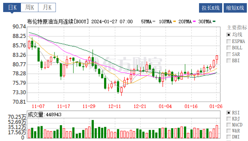 國際油價(jià)方面,受市場樂觀情緒影響,1月26日國際原油價(jià)格上漲。截至當(dāng)天收盤,紐約商品交易所3月交貨的輕質(zhì)原油期貨價(jià)格上漲0.65美元,收于每桶78.01美元,漲幅為0.84%;3月交貨的布倫特原油期貨價(jià)格當(dāng)日上漲1.12美元,收于每桶83.55美元,漲幅為1.36%。
