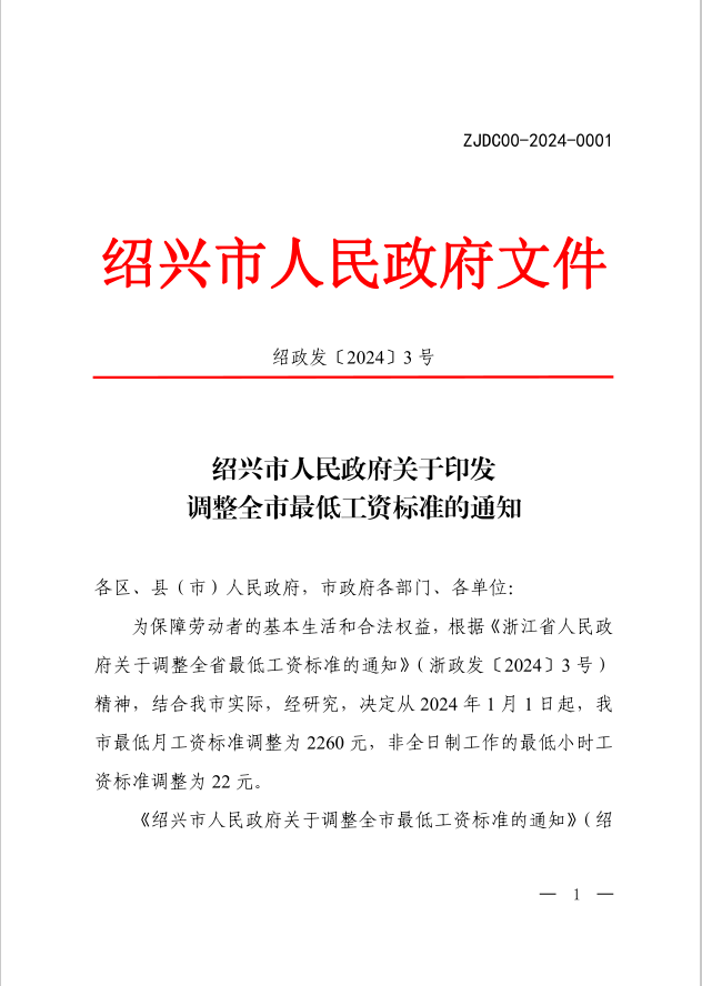 近日,紹興市人民政府印發(fā)《關(guān)于調(diào)整全市最低工資標(biāo)準(zhǔn)的通知》,自2024年1月1日起,我市最低月工資標(biāo)準(zhǔn)從2070元調(diào)整為2260元,非全日制最低小時工資標(biāo)準(zhǔn)從20元調(diào)整為22元。