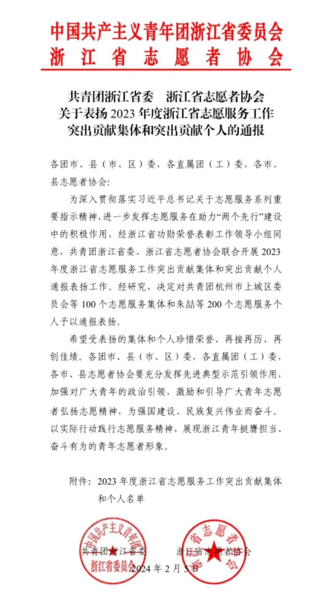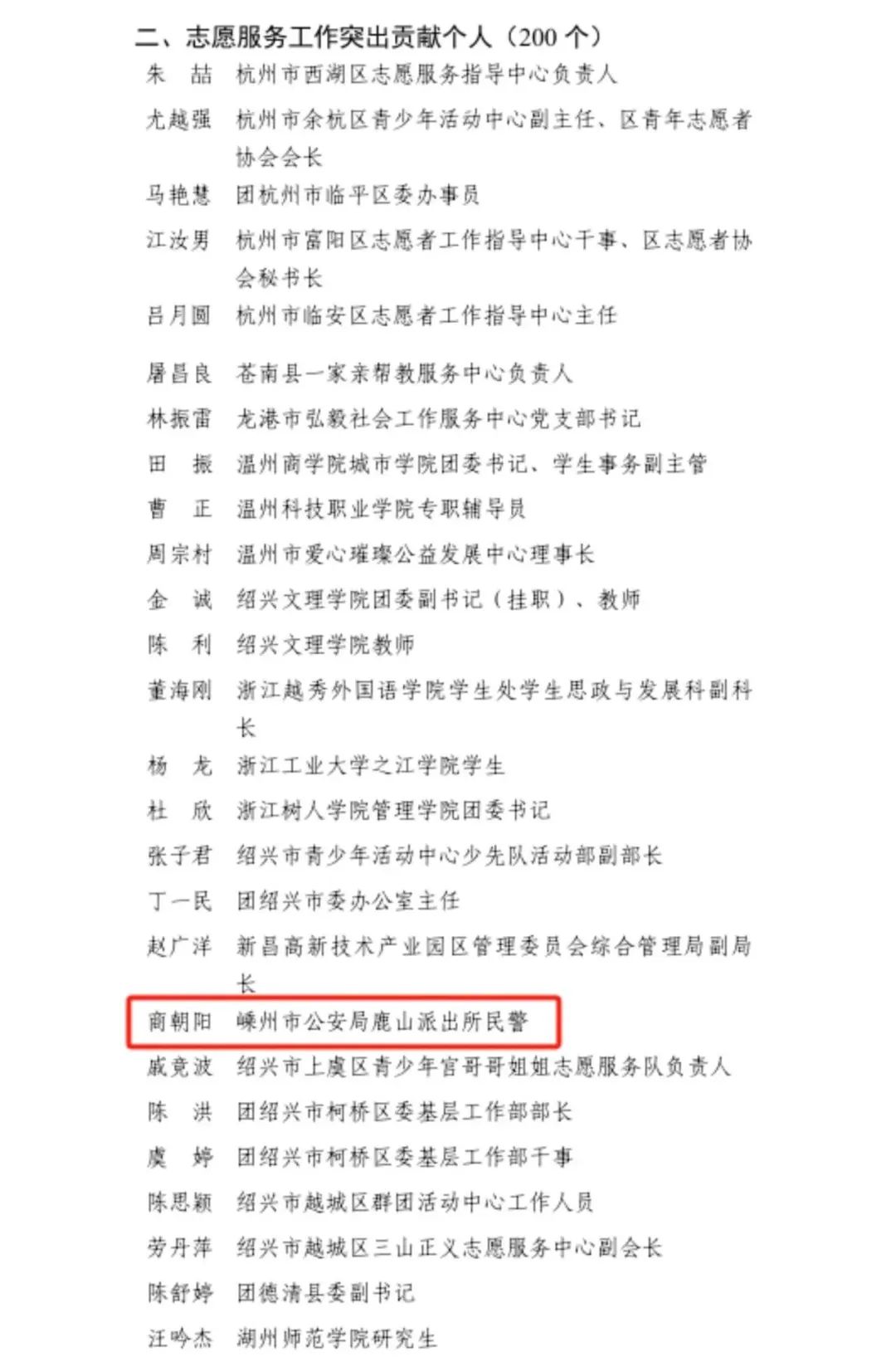 為深入貫徹落實習(xí)近平總書記關(guān)于志愿服務(wù)系列重要指示精神,進(jìn)一步發(fā)揮志愿服務(wù)在助力“兩個先行”建設(shè)中的積極作用,經(jīng)浙江省功勛榮譽(yù)表彰工作領(lǐng)導(dǎo)小組同意,共青團(tuán)浙江省委、浙江省志愿者協(xié)會聯(lián)合開展了2023年度浙江省志愿服務(wù)工作突出貢獻(xiàn)集體和突出貢獻(xiàn)個人通報表揚(yáng)工作。其中,嵊州市公安局民警商朝陽榮獲“2023年度浙江省志愿服務(wù)工作突出貢獻(xiàn)個人”稱號。